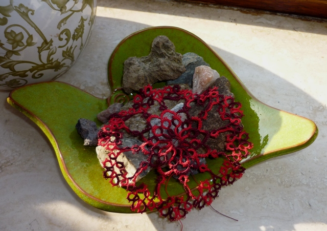 Al een paar keer liet ik zien dat ik hiermee bezig was, maar nu is het dan ook echt af. Het patroontje heet 'speldenkussen in de vorm van een appel', was afkomstig van ene mevrouw van Starkenburg en stond in het tweejaarlijkse kringblad van de Frivolité(k)ring, jaargang 2, no.1 (februari 2002).