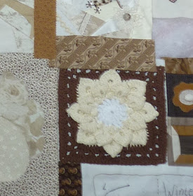 Een gehaakt en een gebreid blok, hoe ga ik dat nu vastzetten aan de rest? Uiteindelijk heb ik ze allebei op een dunne katoenen stof genaaid.